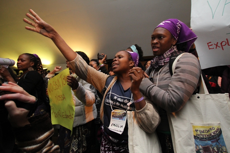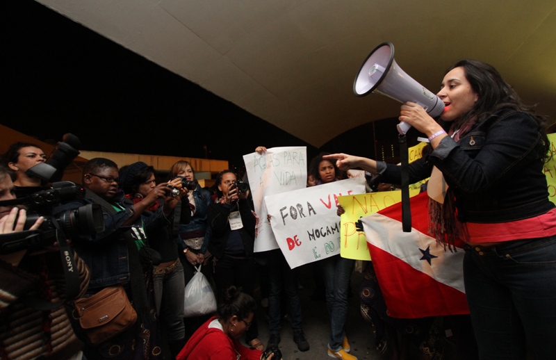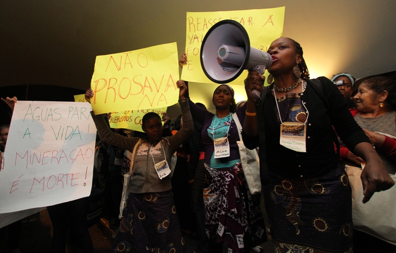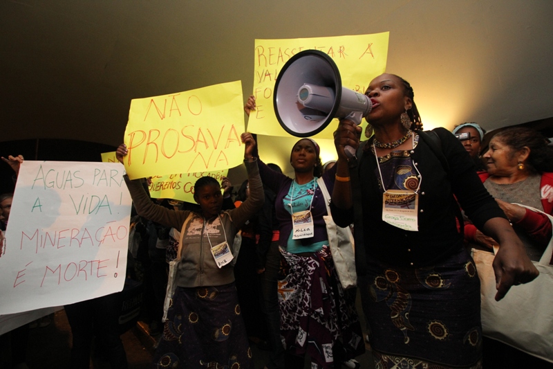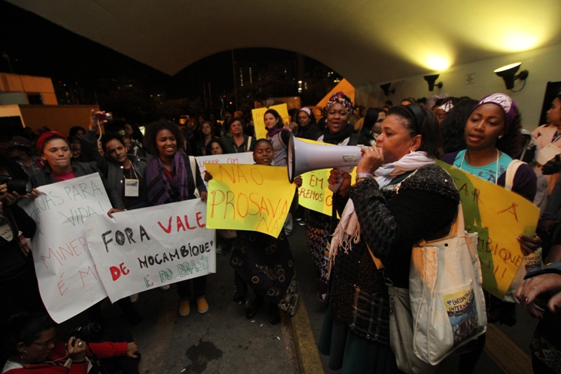 Las militantes salieron del auditorio del memorial con varios carteles y consignas en contra de Vale. En el patio del Memorial, tres militantes de la MMM hicieron uso de la palabra para contar cómo Vale ha venido violando derechos en sus territorios. La mozambiqueña Graça Samo fue la primera a denunciar el papel de Vale en su país. La empresa viene siendo cuestionada por su mina de hierro situada en la provincia de Tete, en donde ha desalojado comunidades, sin ni siquiera haberlas indemnizado adecuadamente.