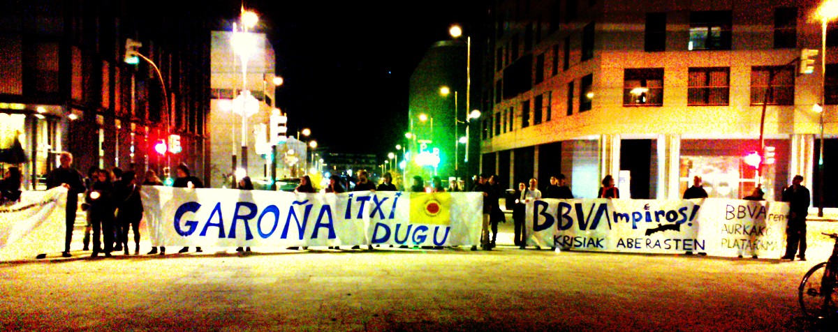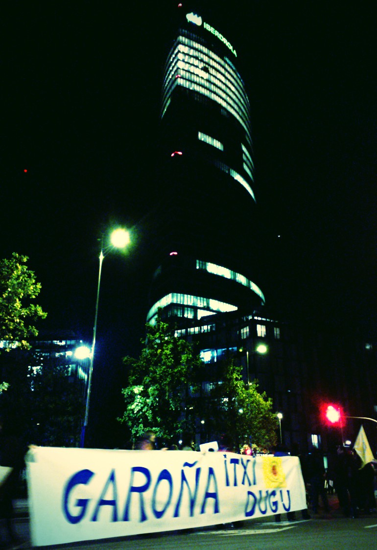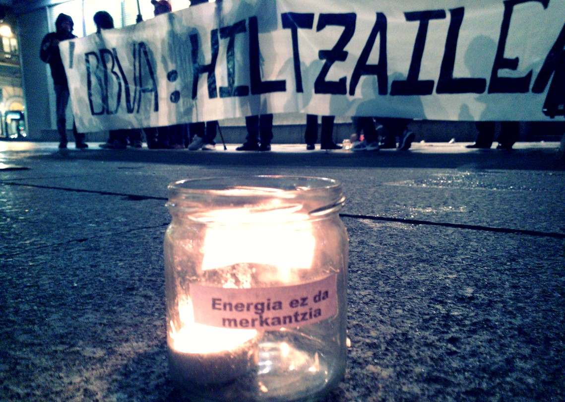 Bajo la luz de las velas, en homenaje a los compañeros y compañeras asesinadas en la lucha contra las transnacionales, los manifestantes marcharon hasta la sede de Iberdrola, un gigantesco edificio que sobresale en la ciudad de Bilbao, y que costó al erario público de esta ciudad, unos 20 millones de euros. Un grupo de jóvenes encabezó la marcha con persecución al estilo brasileño.