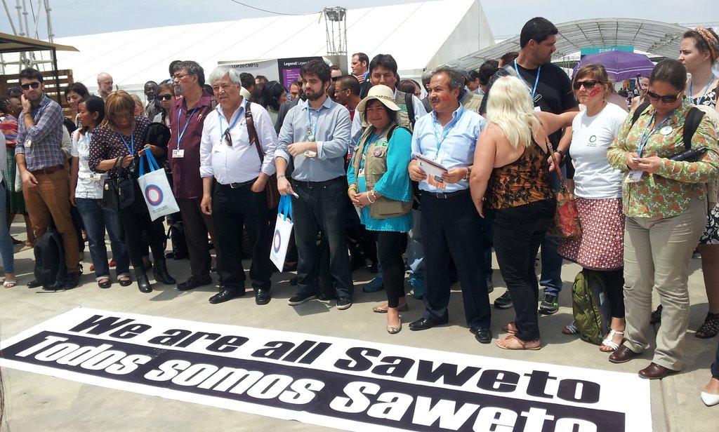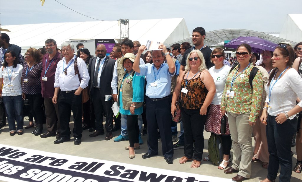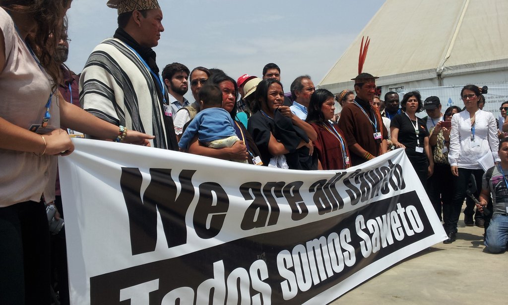 Numerosas organizaciones sociales presentes en la COP de Cambio Climático en Lima, Perú, realizaron este viernes una acción de solidaridad con la comunidad indígena de Alto Tamaya - Saweto de ese país y especialmente con algunas de las viudas y una hija de cuatro dirigentes asesinados hace tres meses en el marco de la lucha por la titulación de sus tierras (vea abajo galería de fotos).