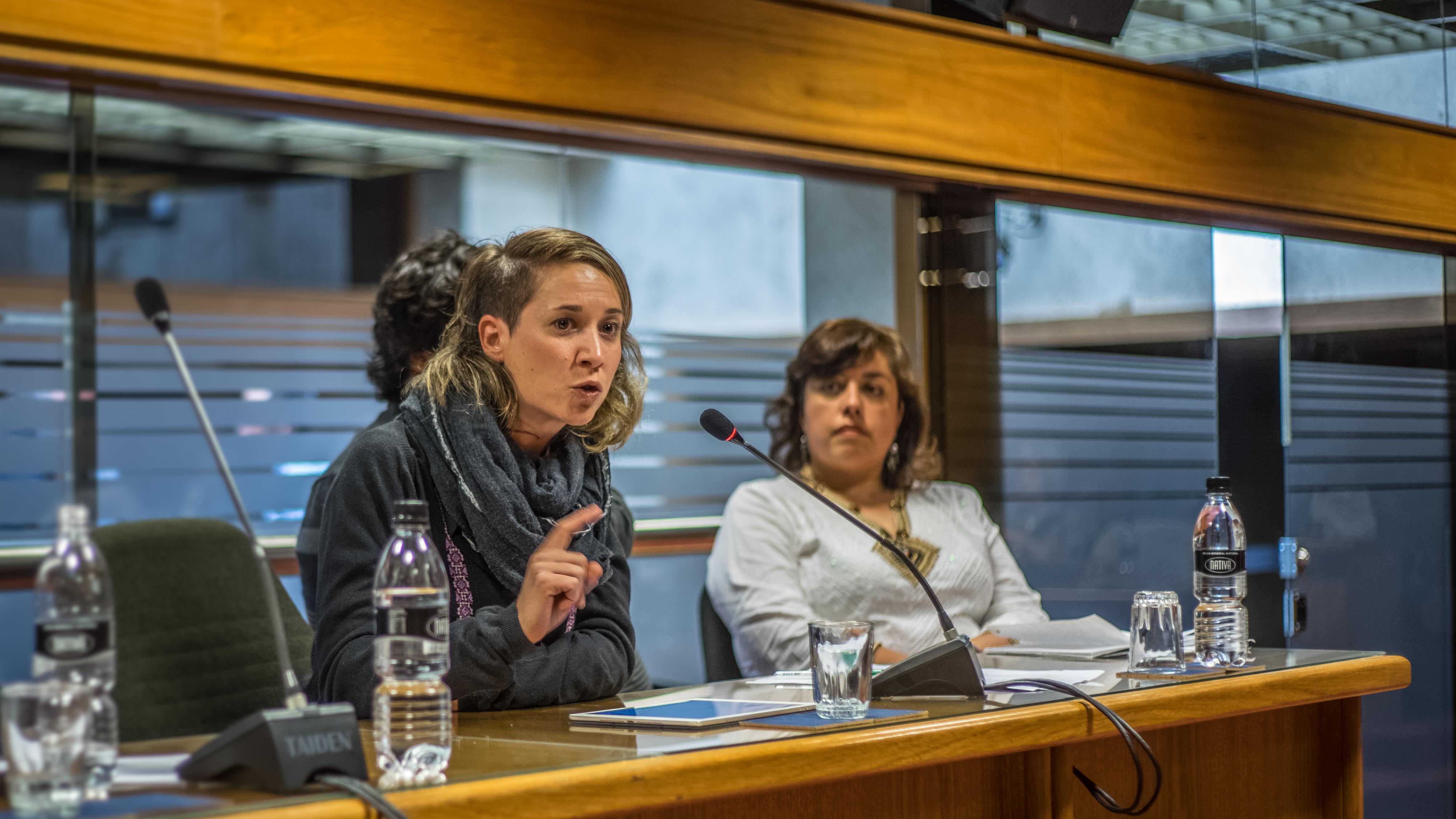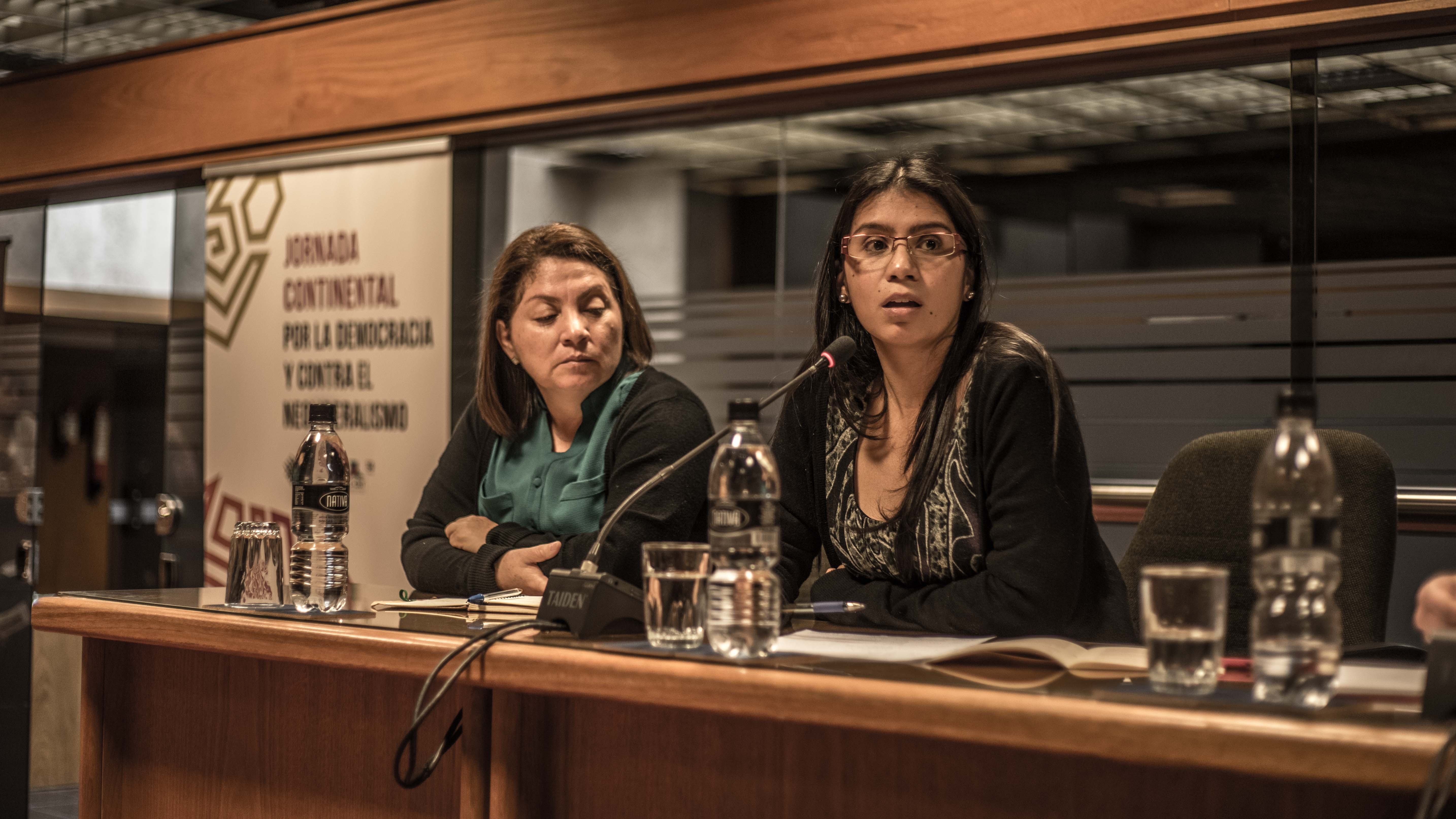 A la tarde las activistas brasileñas Lucia Ortiz, de Amigos de la Tierra Internacional, y Tchenna Maso, del Movimiento de Afectados por Represas de Brasil (MAB), se manifestaron en contra del gobierno golpista de Michel Temer en su país, en una de las reuniones de la EuroLat.