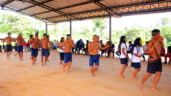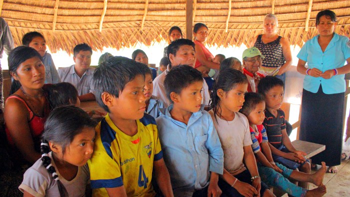 Esta comunidad concentra más habitantes que las demás y tiene infraestructuras educativas en deterioro, hasta en abandono, y un centro de salud, que también servía de albergue para la radiocomunicación entre la base aérea en la ciudad de El Puyo, así como entre las comunidades. Un espacio común que, en el marco de la conmemoración del Día de la Madre, fue abarrotado por familias.