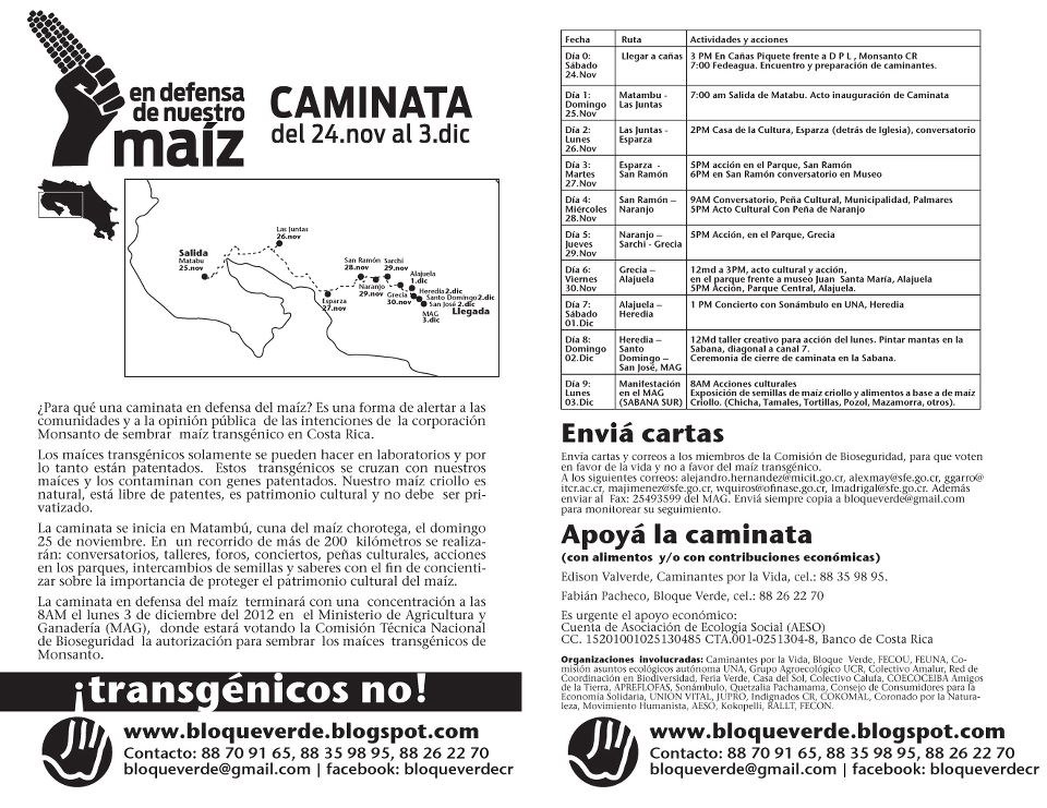Durante el recorrido, los activistas tienen previsto realizar un sinnúmero de actividades públicas, para informar a la población sobre la necesidad de defender y proteger las semillas nativas de la contaminación transgénica de Monsanto. Hace unas semanas, la CTNBio decidió posponer hasta el 3 de diciembre su decisión sobre la solicitud presentada por la subsidiaria de dicha trasnacional de la semilla y los agrotóxicos para sembrar ese tipo de maíz.