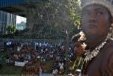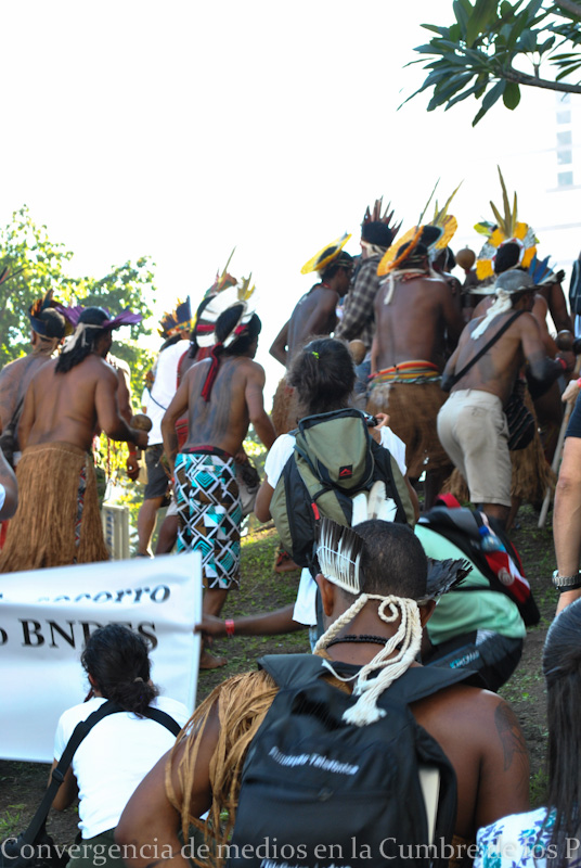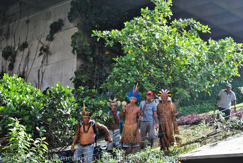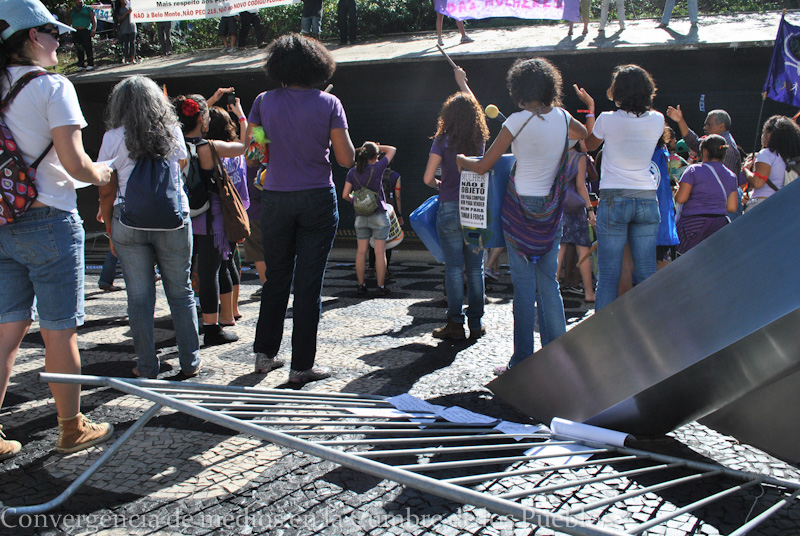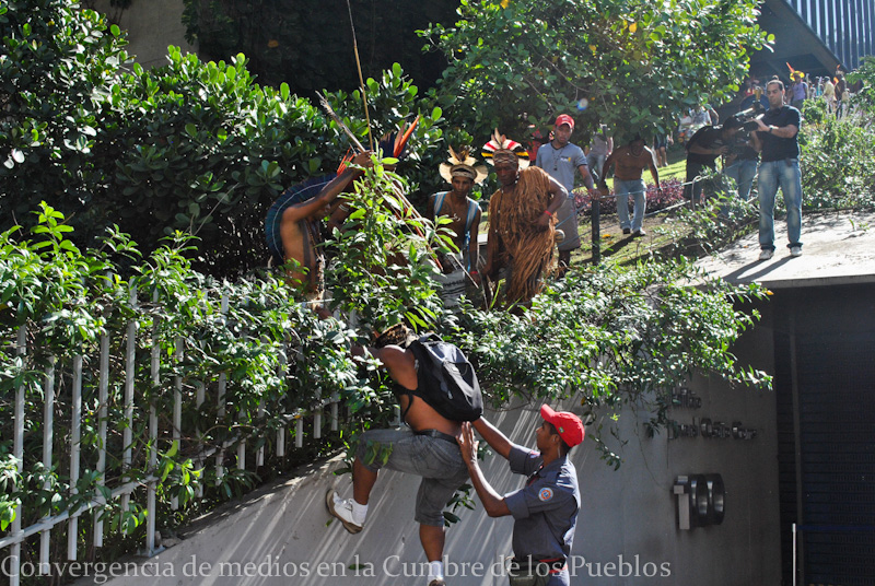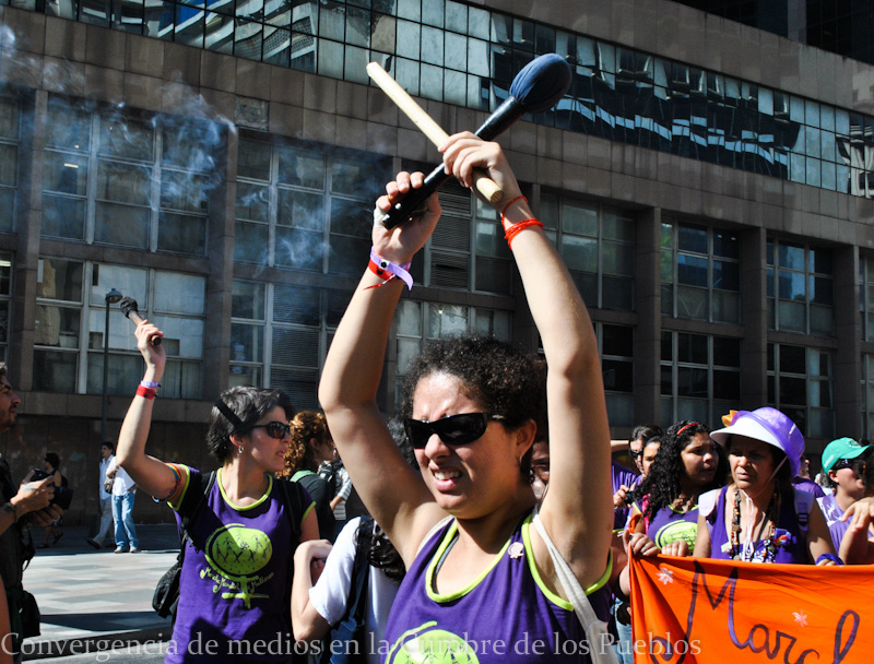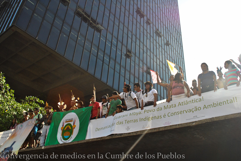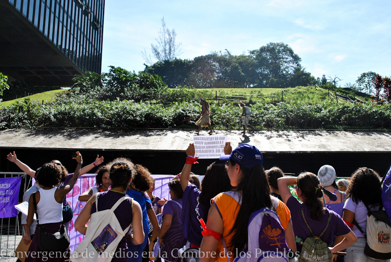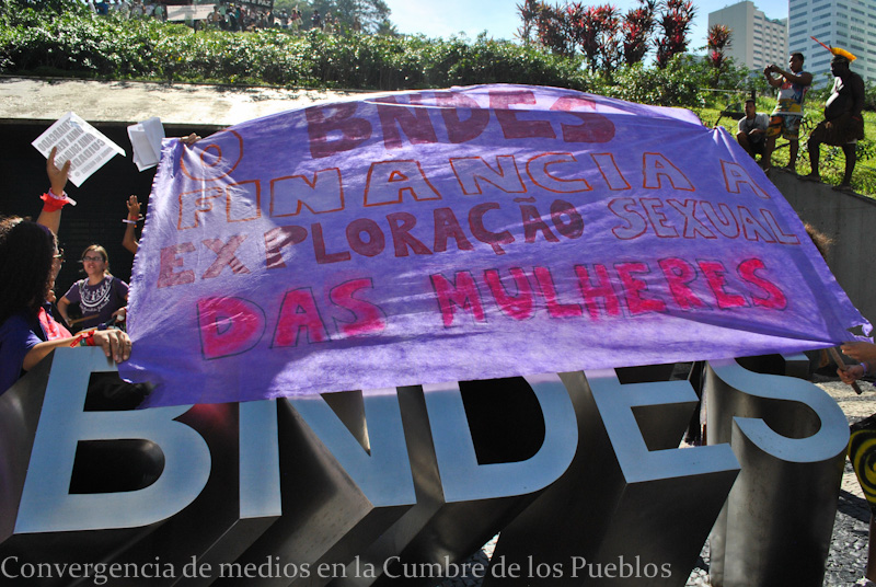 En el primer día de movilización en la Cumbre de los Pueblos miles de mujeres se manifestaron por las calles de Rio de Janeiro. Entre las organizadoras se encuentra la Marcha Mundial de las Mujeres, quienes realizaron una acción de denuncia frente a la sede del Banco Nacional de Desarrollo (BNDES) principal financiador del agronegocio. Al finalizar la actividad, miles de indígenas, también participantes de la Cumbre, se hicieron presentes en el lugar ingresando al territorio del banco y exigiendo ingresar para hablar con algún representante de la institución. Las mujeres en un acto solidario, se acoplaron a la movilización que acababa de llegar.